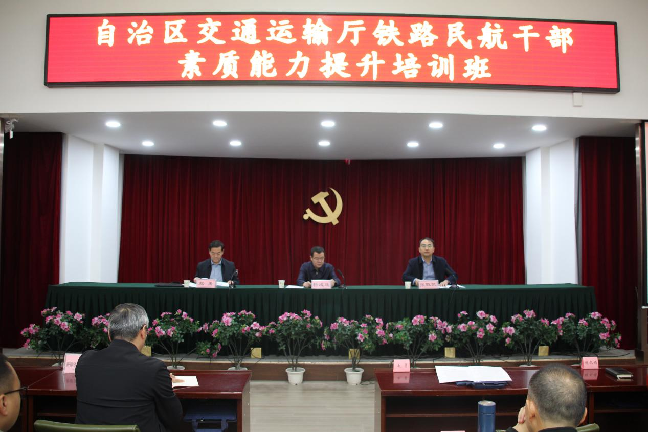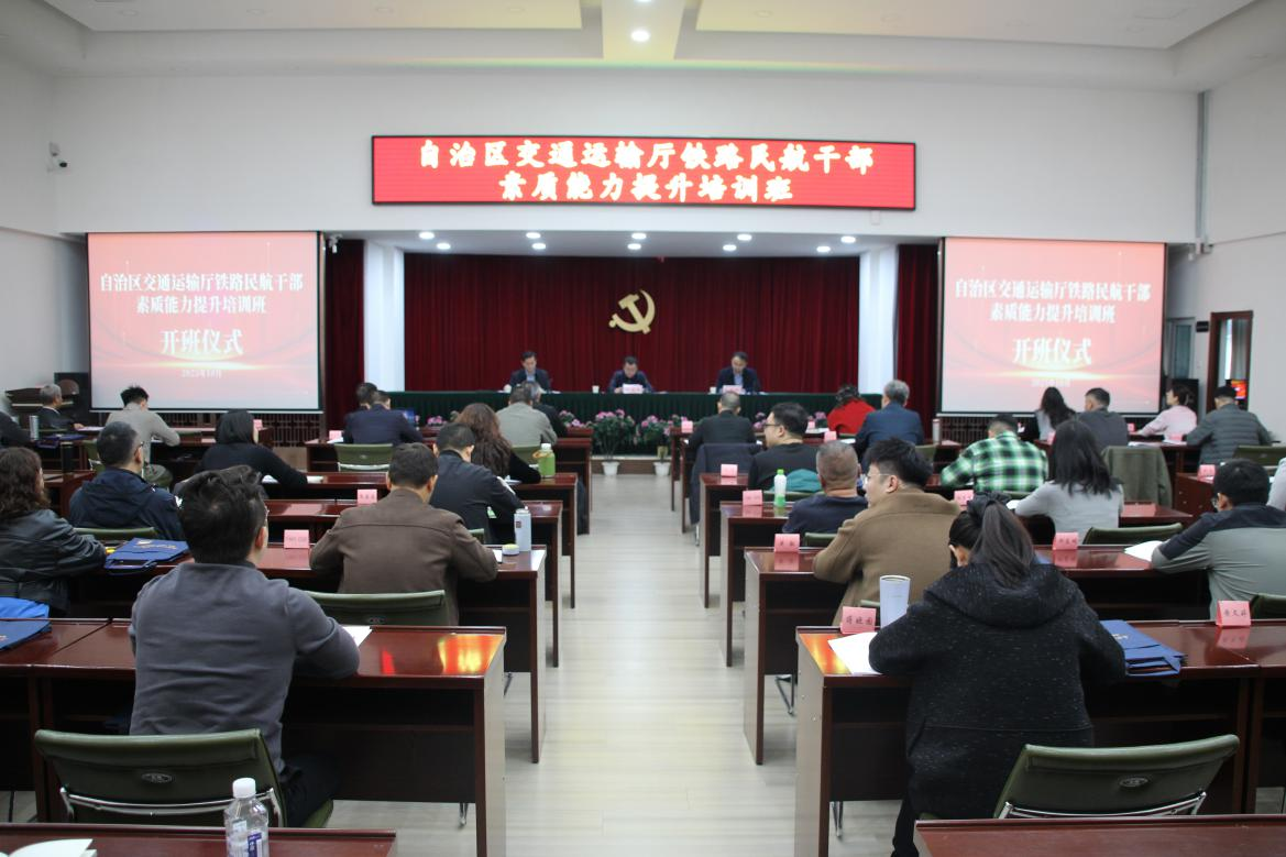 自治区交通运输厅党委委员、一级巡视员杨成连出席开班仪式并讲话,自治区交通运输厅铁航处负责人张敬凯主持开班仪式,自治区铁路民航事业发展中心主任赵勇出席开班仪式。