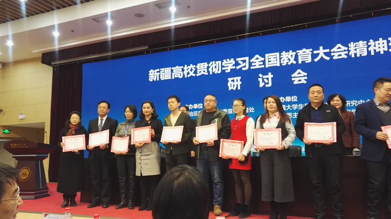 近期,为深入学习贯彻习近平新时代中国特色社会主义思想和全国教育大会精神,总结改革40年来高校思想政治教育工作取得的成就,自治区大学生思想政治教育研究中心面向全区高校思想政治教育工作者征集了124篇理论研究论文。经过论文重复率检测35%以内、专家政治审读、匿名函评和会评等环节,评出一等奖12篇;二等奖16篇;三等奖20篇;优秀奖34篇;优秀组织奖5个。其中马克思主义学院喜获二等奖1篇;三等奖6篇;优秀奖6篇,共获奖13篇,同时取得优秀组织奖。11月24日,我院获奖教师在新疆师范大学参加表彰大会。