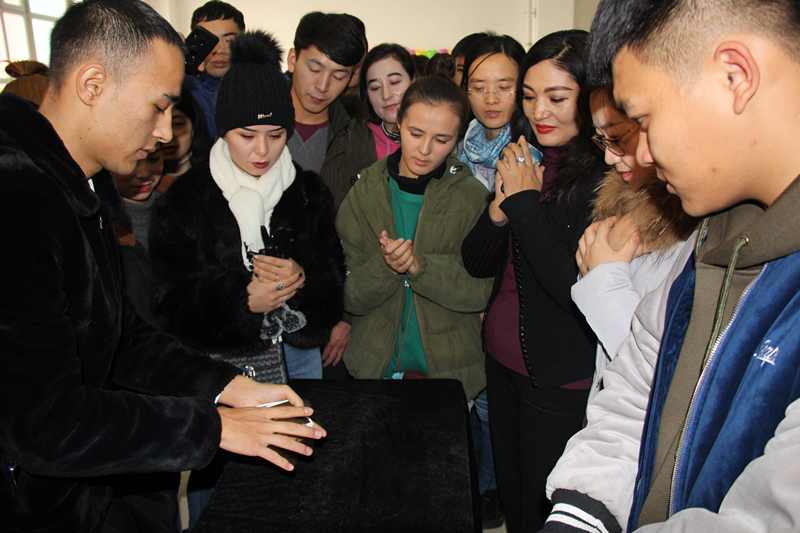 第二区域为魔术表演,在悠扬的乐曲和神秘莫测的舞台环境的衬托下,结对师生一边欣赏着表演者变幻无穷的魔术表演,一边暗地里与魔术师进行既紧张又愉快的智力游戏,无论是表演者还是结对师生,都通过魔术的环节,煅练了对事物的观察、分析、理解能力。养护D161班麦麦提艾力说:“我也要努力学习文化知识,提高自己的国语水平,建设我们美丽新疆!”。