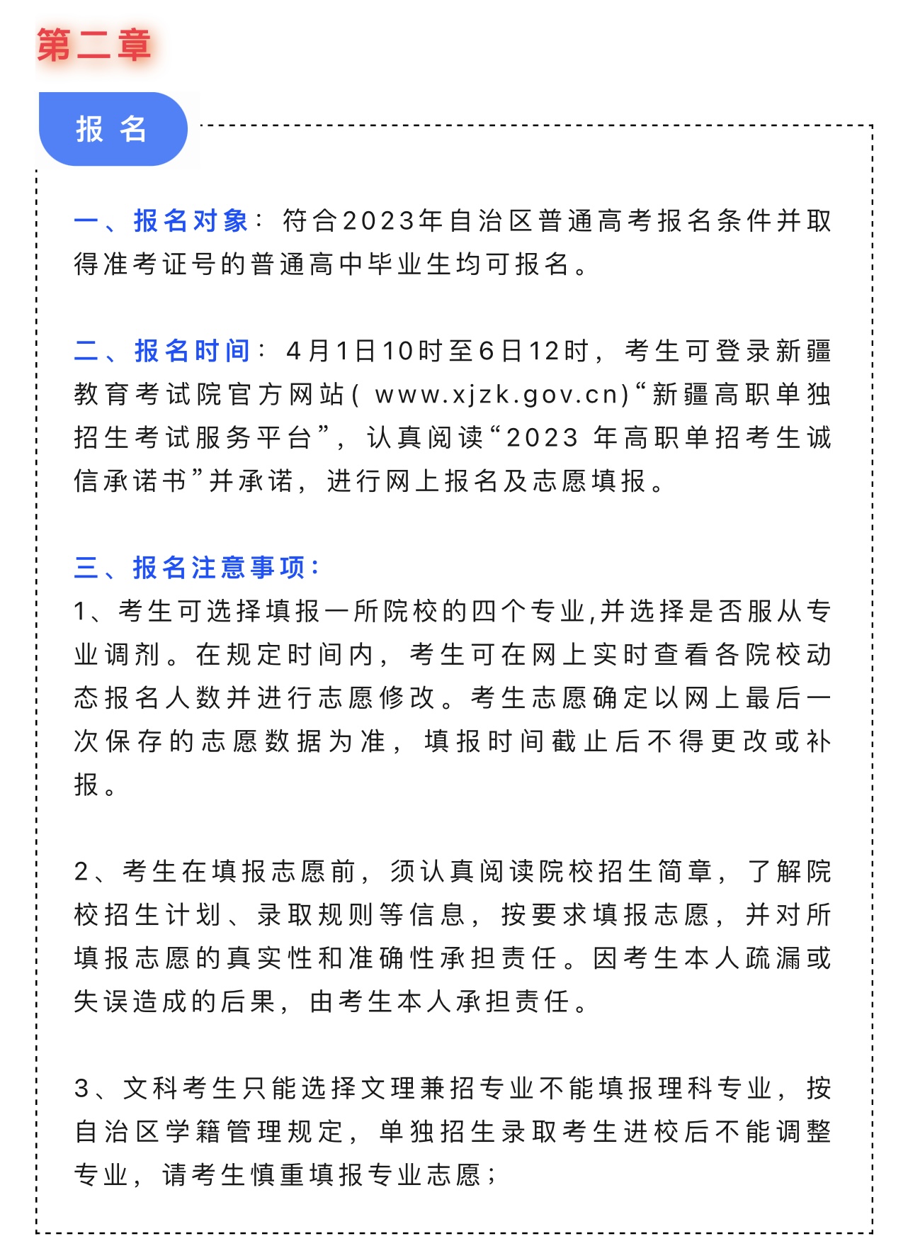 (四)考生确认:4月22日10时至4月24日18时 ,拟录取考生需再次登录新疆教育考试院官方网站(http://www.xjzk.gov.cn)“新疆高职单独招生考试服务平台”,点击“录取信息确认”按钮,选择是否同意录取。未选择同意,视为放弃本次高职单招录取。考生录取信息确认后的名单为招生院校最终录取名单。
