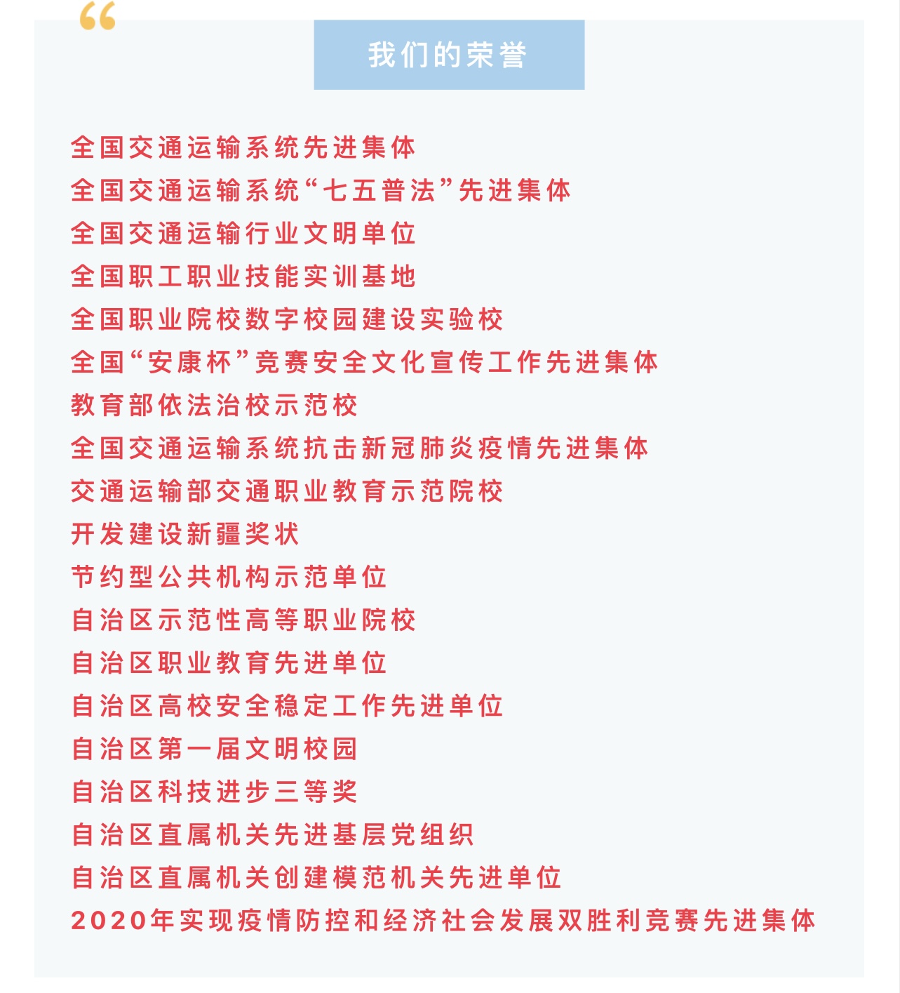 在自治区党委、人民政府和上级部门的正确领导和大力支持下,学院党委全面贯彻党的教育方针和自治区建设“教育强区”的战略思想,主动服务交通运输行业发展和交通强国新疆区试点建设,整体办学实力和核心竞争力得到显著提升,在自治区同类院校中名列前茅,各项事业呈现良好发展态势。同时,学院是国家技能型紧缺人才培养培训基地、国家专业技术人员继续教育基地、国家职业教育汽车维修技术实训基地、第45届、46届世界技能大赛汽车技术项目中国集训基地、教育部依法治校示范校、教育部智能制造领域中外人文交流人才培养基地、全国交通运输实训基地、全国交通运输系统先进集体、全国交通运输行业文明单位、自治区博士后创新实践基地(自治区博士后工作站)。2020年12月31日,由学院牵头,政、行、企、校共42家理事单位共同组建新疆交通运输职业教育集团挂牌成立。