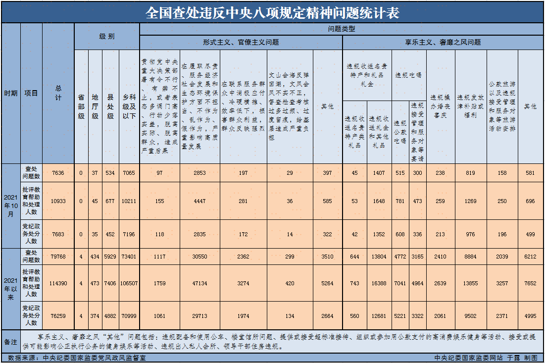 11月24日,中央纪委国家监委公布了2021年10月全国查处违反中央八项规定精神问题汇总情况。今年10月,全国各级纪检监察机关共查处违反中央八项规定精神问题7636起,批评教育帮助和处理10933人,其中党纪政务处分7683人。这是中央纪委国家监委连续第98个月公布月报数据。