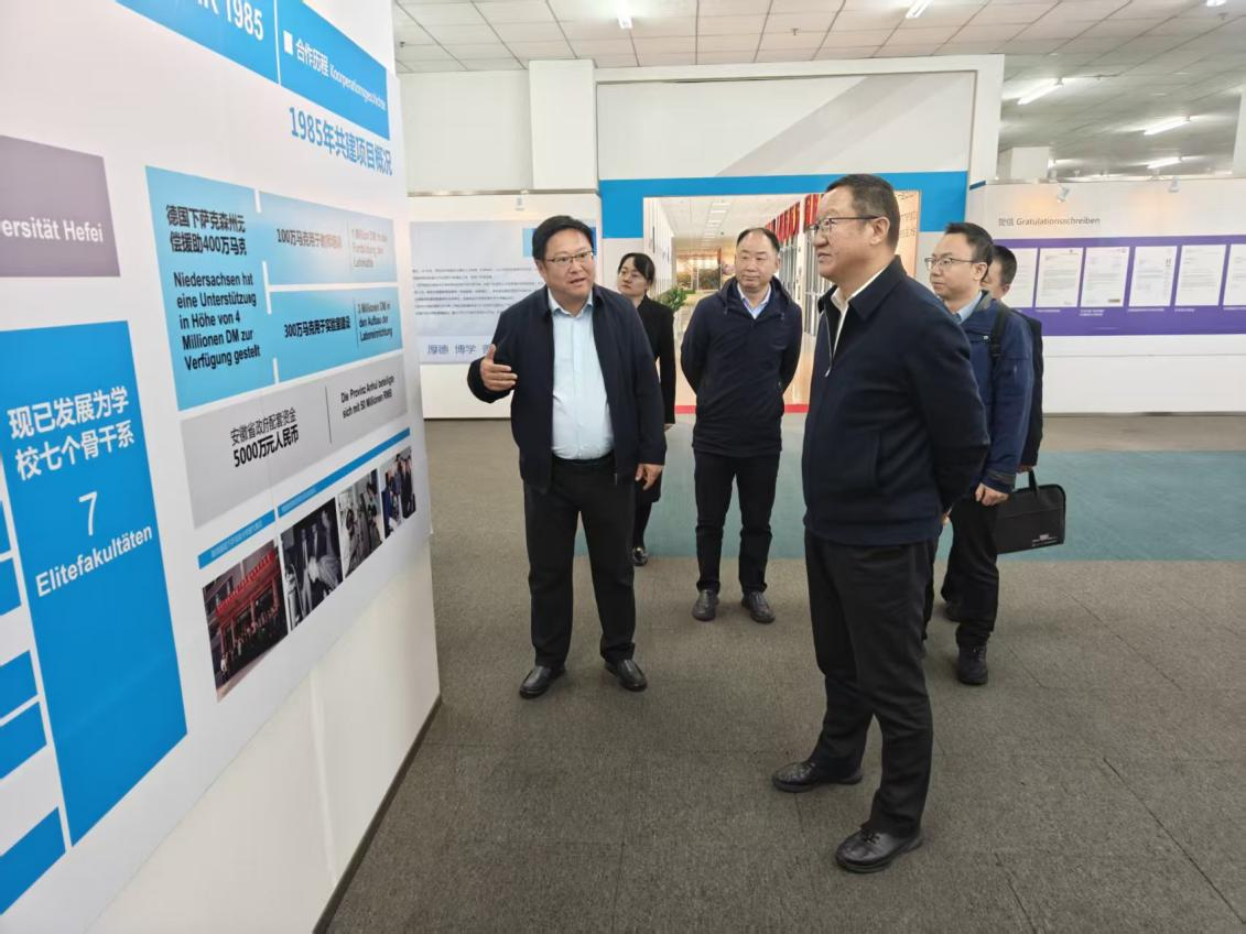 10月24日上午,调研组一行来到此次调研行程中唯一一所普通应用型本科院校——合肥大学。调研过程中,双方就应用型人才培养模式进行了深入交流。合肥大学党委书记邬平川分享了该校在“中德务实合作”背景下的办学经验,通过与德国高校和企业合作,引进德国先进的职业教育理念和教学资源,开展联合培养项目,提升了学生的国际竞争力。在中德共建合肥大学展览现场,刘洪波指出,合肥大学的国际合作经验对我们建设职业本科大学具有重要借鉴意义,新疆地处“一带一路”重要节点,我们要进一步加强与中亚国家高校的国际交流合作,通过拓展国际交流合作项目,引进国外优质资源,不断提升学校的国际化办学水平,为培养具有国际视野的高素质技术技能人才奠定坚实基础。